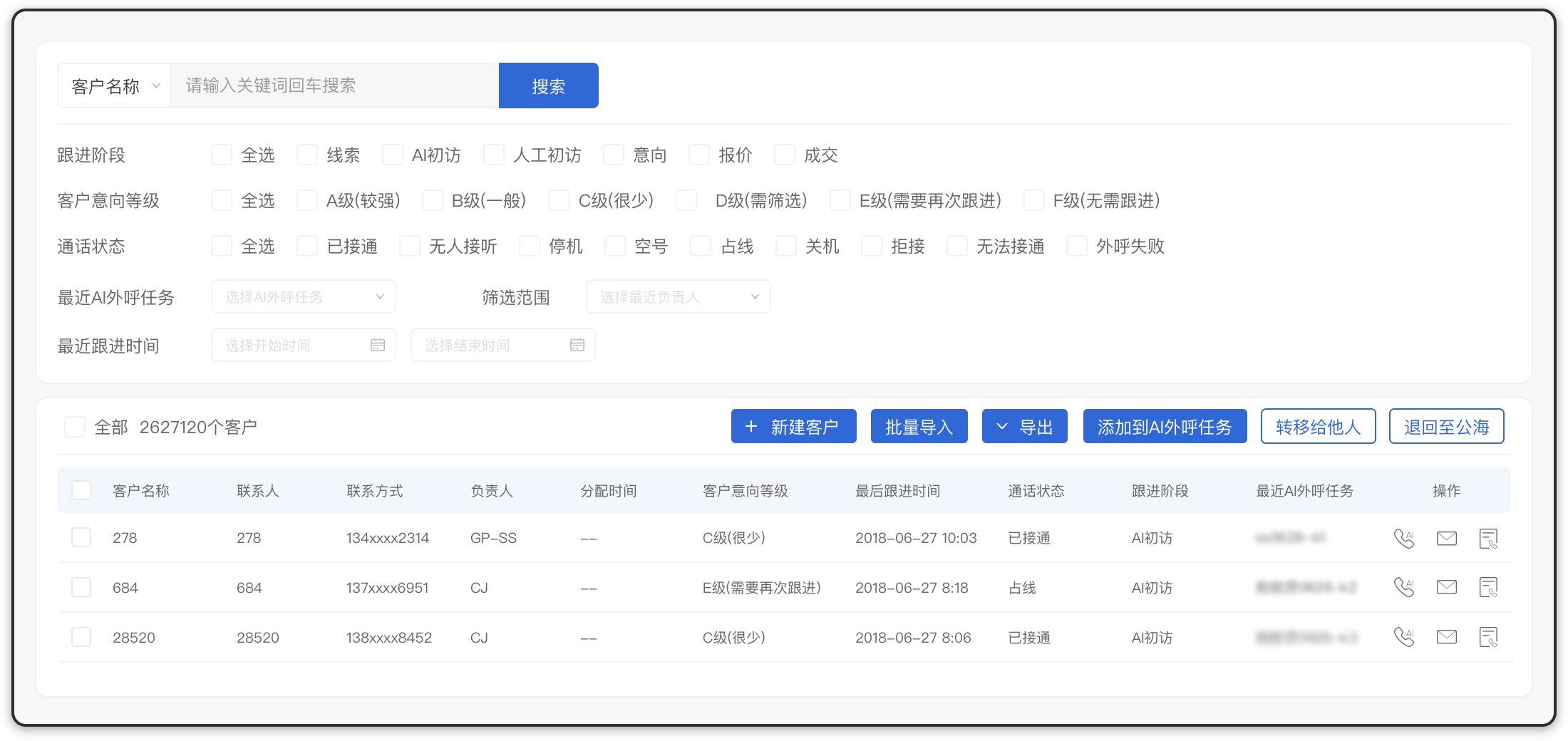 电销机器人电话拨打结束后,系统会根据对话录音自动记录、分析和标记意向客户,您也可以设定意向标记的标准(如问到价格或操作方式即视为高意向客户),您可以根据后台客户情况进行二次跟进